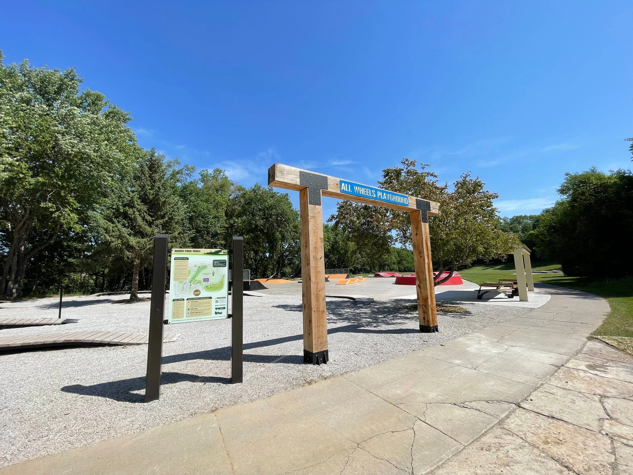 Parking is available next to the All Wheels Zone Playground and at the Adams Park Community Center, which is located across the street from the Southside Bike Park flow trails. The south side of the park features a network of progressive flow trails designed for year-round mountain biking. On the northwest side, visitors can find a pump track, a skills zone, and several natural surface trail loops in the trees, providing options for all ages, abilities, and adventure levels.
